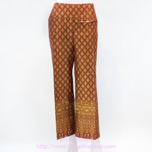 กางเกงขาตรงลายไทยทั้งตัว สีสันสวยงาม ใส่สบาย ซักไม่หด เหมาะแก่ชุดเครื่องแบบหมอนวดไทย นวดสปา ชุดสปา ชุดพนักงานต้อนรับโรงแรม ตัดเย็บออกแบบโดย ร้านฟ้าใสไทยแลนด์